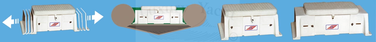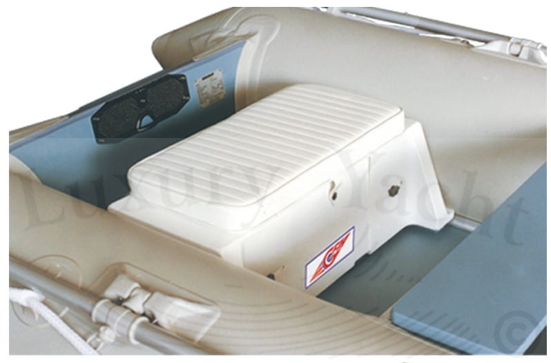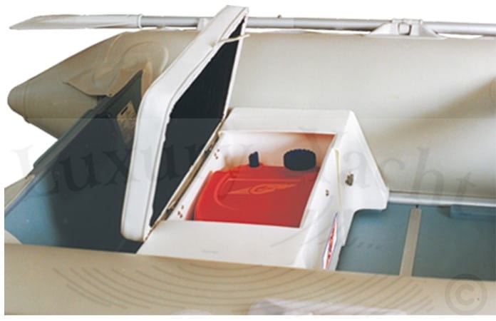 Schowek o regulowanej długości od 600 do 800 mm. Zalecany do pontonów od 2,40 do 3,50 m, ponieważ jest regulowany w zależności od odległości wzmocnień wewnętrznych pontonu. Może zmieścić zbiornik paliwa do 12 l. (nasze kody 300104 -300108 - 300113) lub może być używany jako przydatny schowek na przedmioty.
